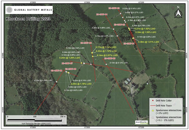 The drilling program defined a swarm of pegmatite dikes across the Knockeen zone with all holes (23-1597-01 to 09) intersecting lithium bearing spodumene pegmatites, seven of which reported multiple intersections. The drill holes were focused in three areas north-east (holes 1-4), central (holes 5-6) and south-west (holes 7-9). The drilled extension of the pegmatite dyke swarm is 500m on strike and extends about 200m vertically. The target area is still open in all directions and also at depth and these aspects will be the focus for the next stage of exploration activities.