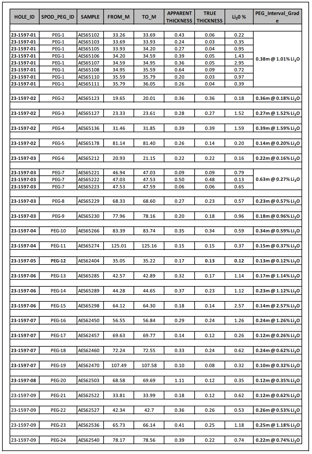 - Values grading over 1% Li2O were recorded in five of the nine holes drilled (Hole 23-1597-01, Hole 23-1597-02, Hole 23-1597-06, Hole 23-1597-07 and Hole 23-1597-09) with a sixth hole (Hole 23-1597-03) just shy of the 1% mark reporting a 0.96% Li2O intersect; and