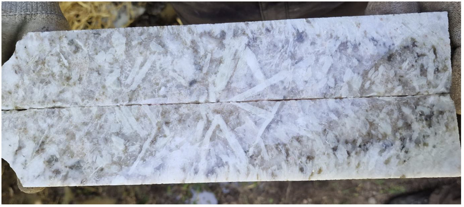 Image 1: Spodumene pegmatite in drill core DDH 23-1597-01