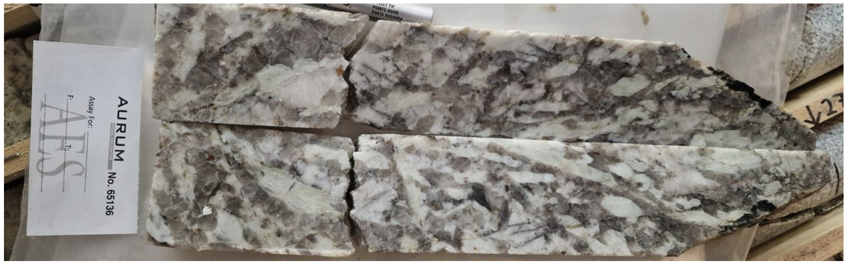 (PEG-22; 65.73-66.14m. Sample AES62536 reporting 0.36m @ 1.18% Li2O)