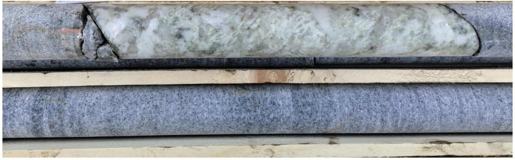 Image 2: Spodumene pegmatite in drill core DDH 23-1597-02