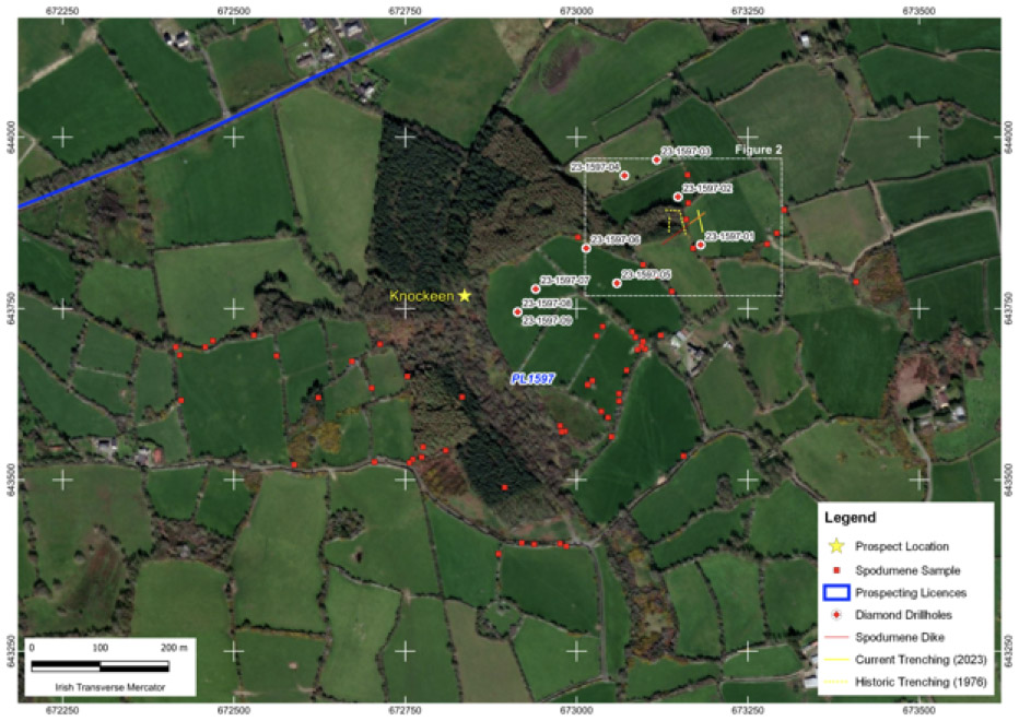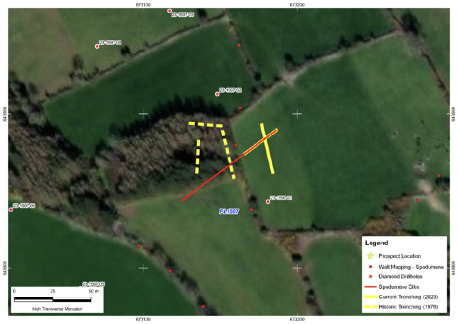 The current phase of detailed exploration work returns to an area where a forty-year-old historical company report1 described a trench excavated at Knockeen Townlands on PLA 1597 which, uncovered in bedrock, exposed a 1.8m wide spodumene-bearing pegmatite dike. However, no detailed laboratory assays or geological maps of the trench were reported at that time. Historical prospecting around the trench also reported the occurrence of up to 10 large boulders of spodumene bearing pegmatite at surface. This work will help inform 2024 exploration planning.