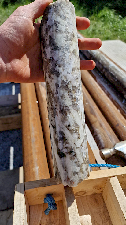 GBML has completed four drill holes (DDH-23-1597-01 – DDH-23-1597-04) for a total of 656m, with drilling now underway at DDH-23-1597-05. Further to the Company’s June 7, 2023 Program Update, several drilling adjustments have been applied based on the measured pegmatite dike geometries and orientations which were intersected in the first hole. GBML has succeeded in intersecting multiple dikes within the host granites to reveal a structurally controlled LCT pegmatite system, which importantly includes spodumene pegmatite that continue to be logged, sampled and subsequently dispatched for analysis at ALS Laboratories. See Images 1-2 below.