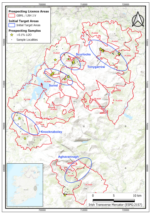 Located south of Dublin in the counties of Wicklow and South Carlow, the Leinster Lithium Project consists of 16 prospecting license areas situated along strike to the joint Ganfeng Lithium / International Lithium Corporation Blackstairs Lithium Project. The total license holding covers approximately 525 km² along and adjacent to the East Carlow Deformation Zone (ECDZ) and associated splay structures which are now recognized as the major controlling structures to pegmatite emplacement across the region. In addition to the Company’s ongoing drill program at Knockeen, a new and focused phase of associated exploration activities is in the advanced stage of planning and due to commence soon. These programs will take place across GBML’s Northern License Block will include detailed prospecting and mapping programs that will initially target the five known occurrences of lithium pegmatites discovered by the Company during previous phases of exploration (see Tables 1 and 2) and will extend out along interpreted structural corridors within the granite and at granite pluton margins with the Lower Paleozoic metasediments and metavolcanics.