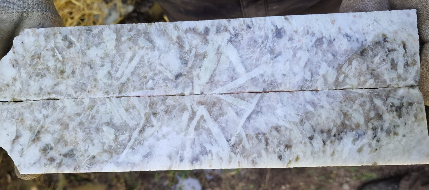 Image 1: Spodumene pegmatite in drill core DDH 23-1597-01