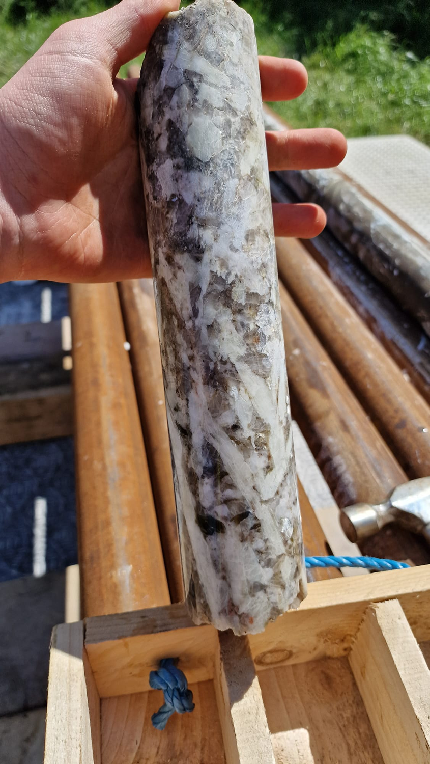 GBML has completed four drill holes (DDH-23-1597-01 – DDH-23-1597-04) for a total of 656m, with drilling now underway at DDH-23-1597-05. Further to the Company’s June 7, 2023 Program Update, several drilling adjustments have been applied based on the measured pegmatite dike geometries and orientations which were intersected in the first hole. GBML has succeeded in intersecting multiple dikes within the host granites to reveal a structurally controlled LCT pegmatite system, which importantly includes spodumene pegmatite that continue to be logged, sampled and subsequently dispatched for analysis at ALS Laboratories. See Images 1-2 below.