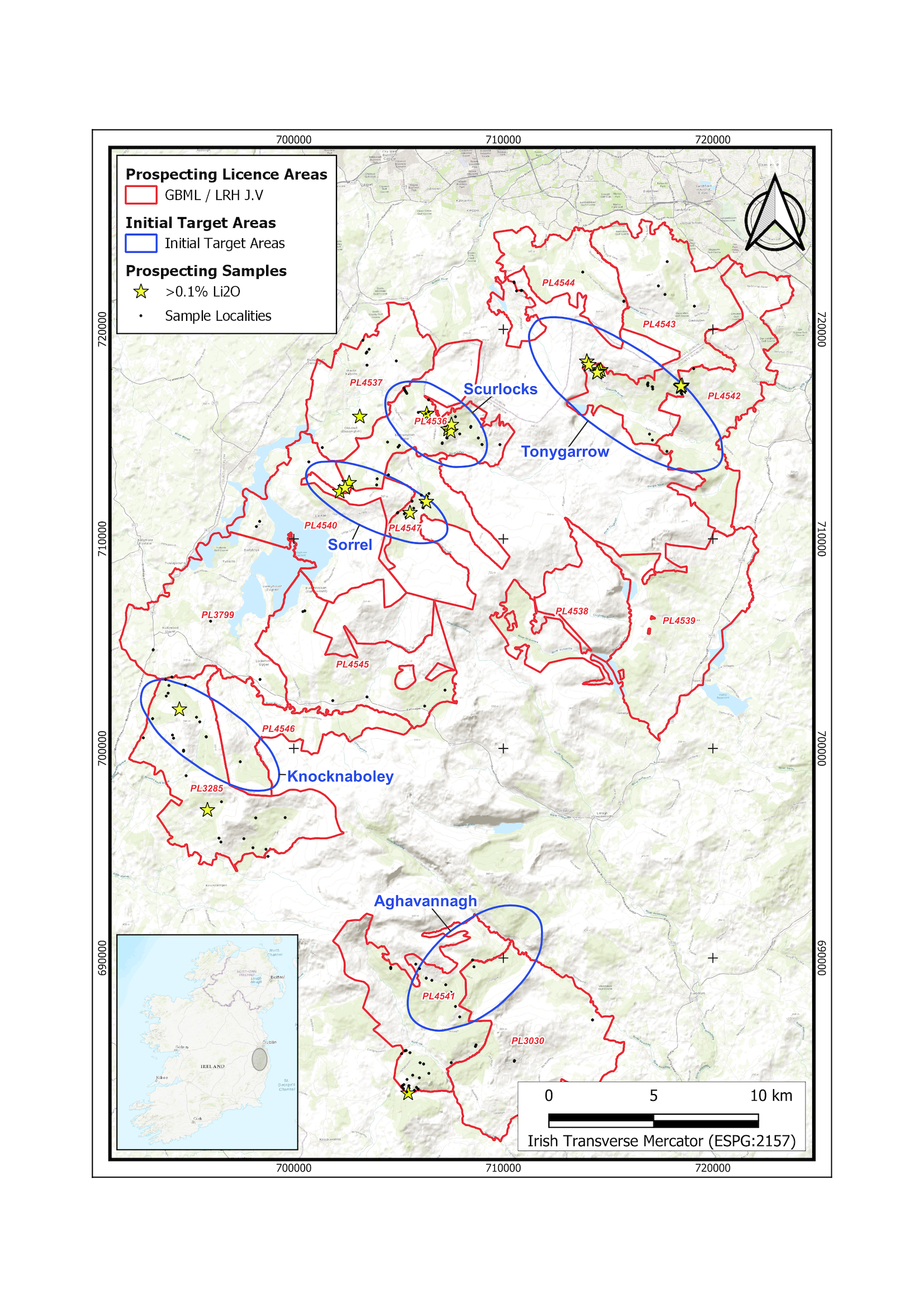 Located south of Dublin in the counties of Wicklow and South Carlow, the Leinster Lithium Project consists of 16 prospecting license areas situated along strike to the joint Ganfeng Lithium / International Lithium Corporation Blackstairs Lithium Project. The total license holding covers approximately 525 km² along and adjacent to the East Carlow Deformation Zone (ECDZ) and associated splay structures which are now recognized as the major controlling structures to pegmatite emplacement across the region. In addition to the Company’s ongoing drill program at Knockeen, a new and focused phase of associated exploration activities is in the advanced stage of planning and due to commence soon. These programs will take place across GBML’s Northern License Block will include detailed prospecting and mapping programs that will initially target the five known occurrences of lithium pegmatites discovered by the Company during previous phases of exploration (see Tables 1 and 2) and will extend out along interpreted structural corridors within the granite and at granite pluton margins with the Lower Paleozoic metasediments and metavolcanics.