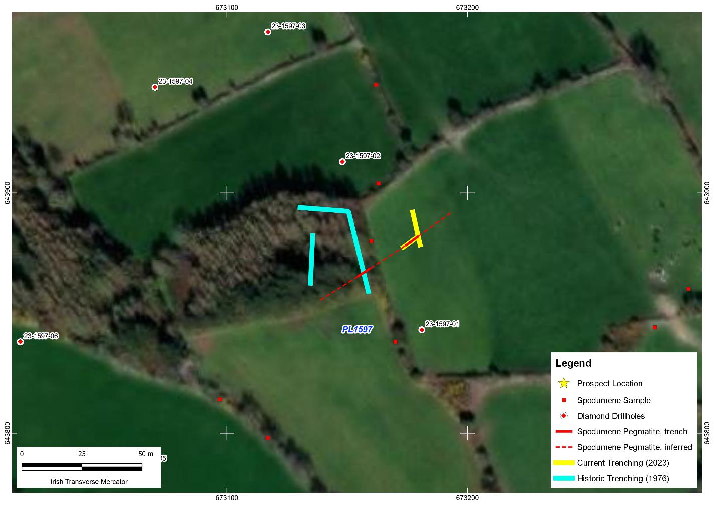 The trenching will also assist in the interpretation of the spodumene bearing pegmatite dikes encountered in the 2023 summer drilling program. The dike dips northwestwards at approximately 40 degrees. This trench pegmatite is interpreted to be the same pegmatite intersected at 30m depth in drill hole 23-1597-02 and at 60m depth in drill hole 23-1597-03. This gives a total down dip extension of at least 100m from surface. This dike is just one of the spodumene bearing dikes intersected in the drilling which form a broadly NE-SW trending dike swarm of up to seven dikes in 24 separate intercepts in nine diamond cored drill holes.