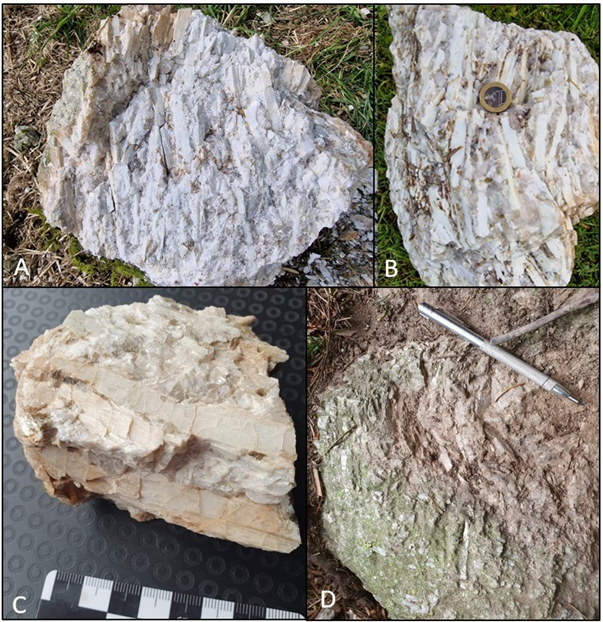 A & B Spodumene pegmatite field samples Knockeen, C Spodumene pegmatite Knockeen Sample 210724CL05 (2.95% Li2O), D Spodumene pegmatite Carriglead Sample AES61138 (1.61% Li2O)