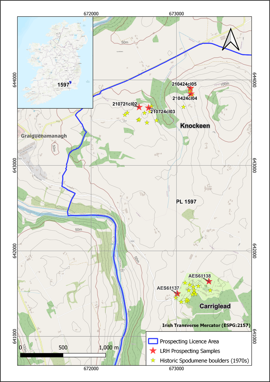 PLA 1597 was identified as prospective for lithium pegmatite potential by the Company’s Project partner LRH and its exploration consultants Aurum Exploration Services (“Aurum”) following detailed desktop studies which outlined two proximal areas of spodumene-bearing pegmatite reported by previous operators in the mid 1970s as part of their exploration programmes. The lithium pegmatite boulder trains at Knockeen and Carriglead are separated by a north-south valley and form an initial area of interest covering approximately 2km east-west and 1km north-south. A historical exploration map and report also described a trench excavated at Knockeen as having uncovered a 1.8m wide bedrock spodumene-bearing pegmatite vein, however no detailed laboratory assays or geological maps of the trench were reported at that time.