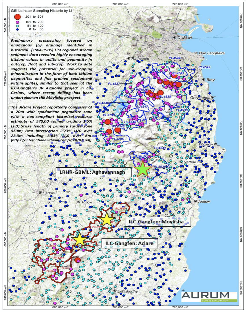 The NW Leinster Aghavannagh drill target is located within 20km of the Moylisha property and 30km of the Aclare projects being drilled by US$2.5B market cap., Chinese lithium company, Ganfeng Lithium Co. Ltd., in association with International Lithium Corporation.