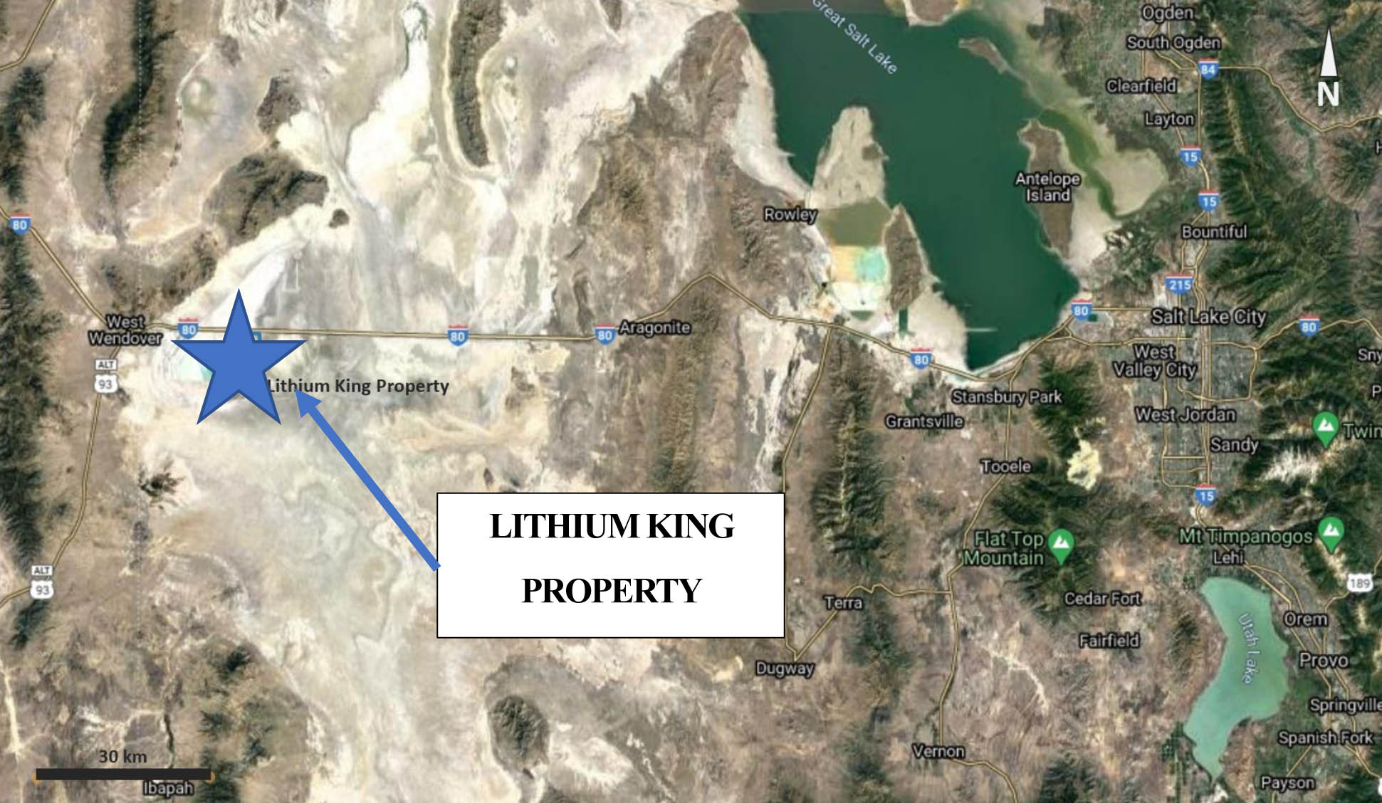 The Lithium King Property is located on the west side of the Great Salt Lake Basin in western Utah, adjacent to the community of Wendover, Utah. The land position consists of approximately 1,760 acres of placer claims. The property has the potential to host a lithium and magnesium brine deposit in an existing mineral producing location in a mining-friendly state (see Company news release from March 4, 2021 for detailed project review).