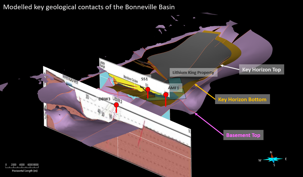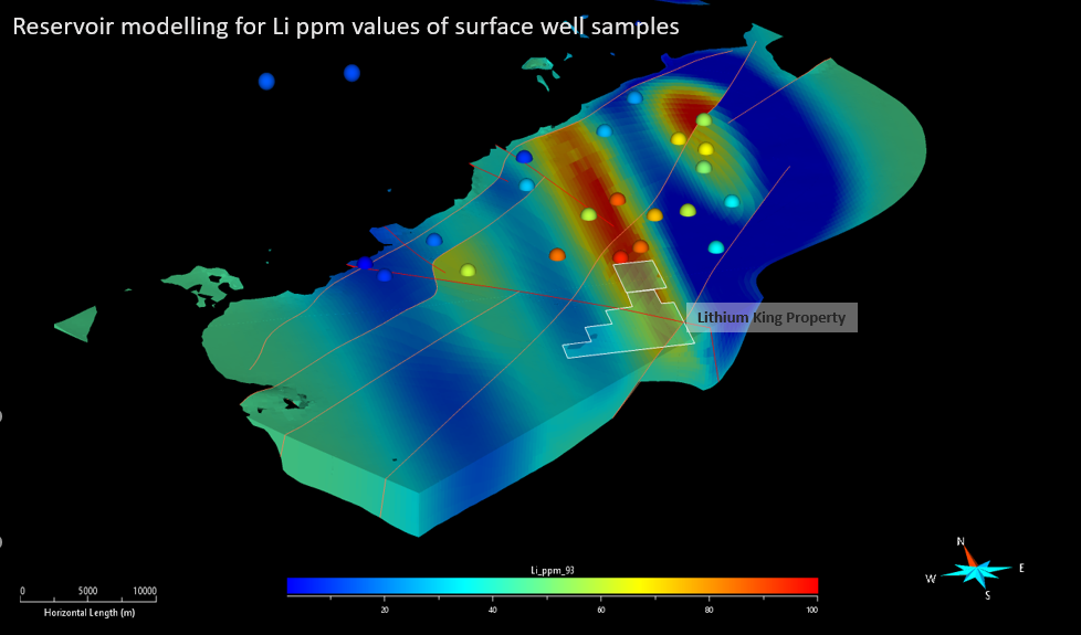 The interpretation of the key horizon* was used to generate a reservoir model in which the surface water sample values for Li ppm** were extrapolated.